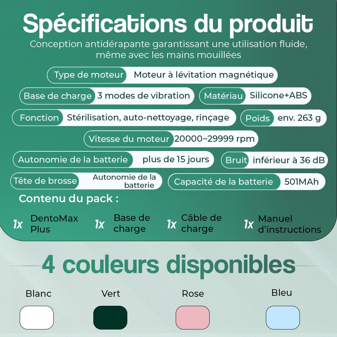 - Tête de brosse : poils souples, silicone de qualité alimentaire