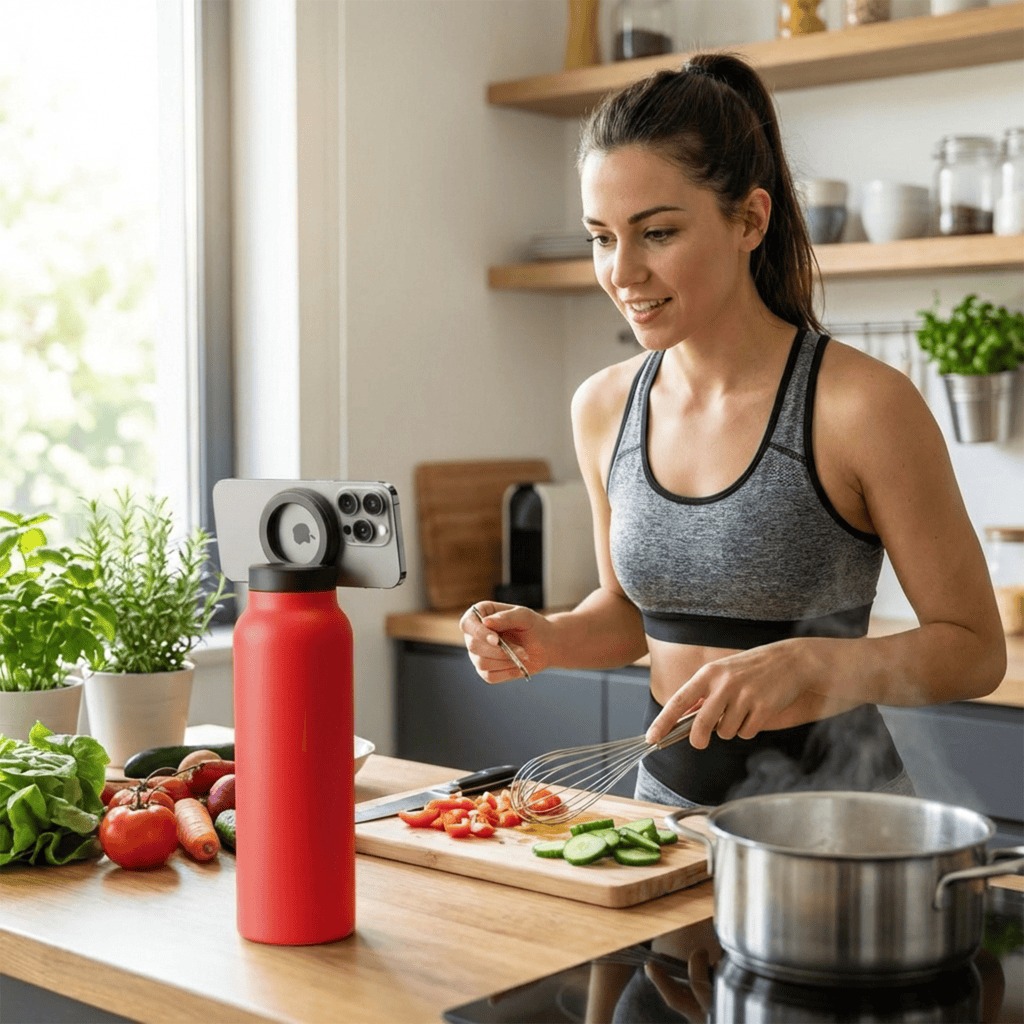 Avec GripSip, vous posez votre téléphone d’un seul geste de façon stable et visible — exactement là où votre bouteille se trouve déjà.