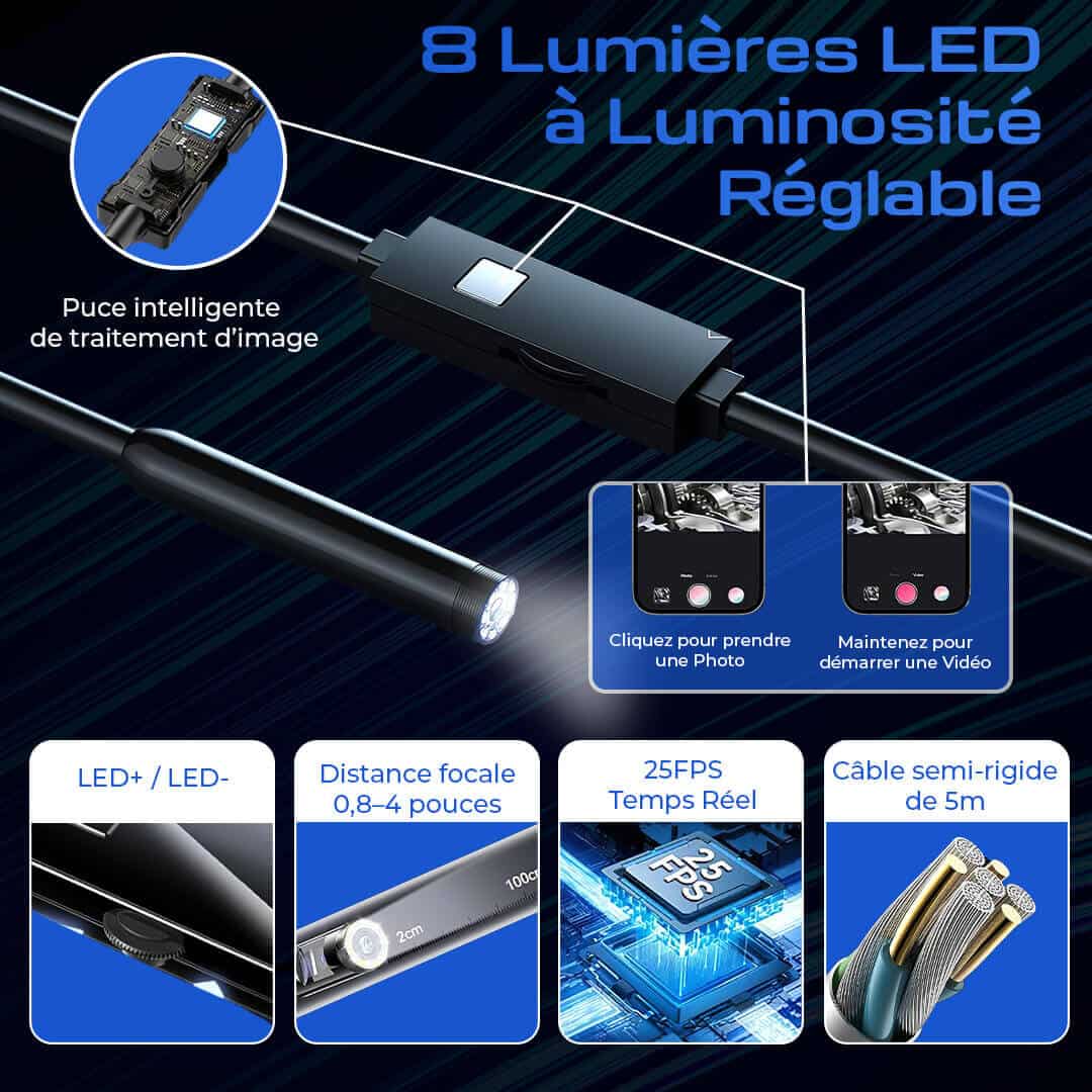 Grâce à son câble semi-rigide qui garde sa forme et ses 8 LEDs qui éclairent chaque recoin, vous résolvez vos problèmes plus vite et plus intelligemment.