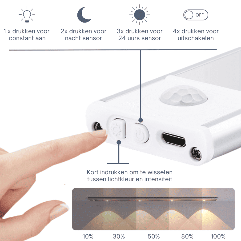 Kies de stand die bij jou past! Of je nu een sfeervolle nachtrust wilt creëren met de nacht sensor mode of altijd zichtbaarheid nodig hebt met de always on mode, met de LUMILITE™ LED Sensor Verlichting kun je het aanpassen naar jouw wensen.