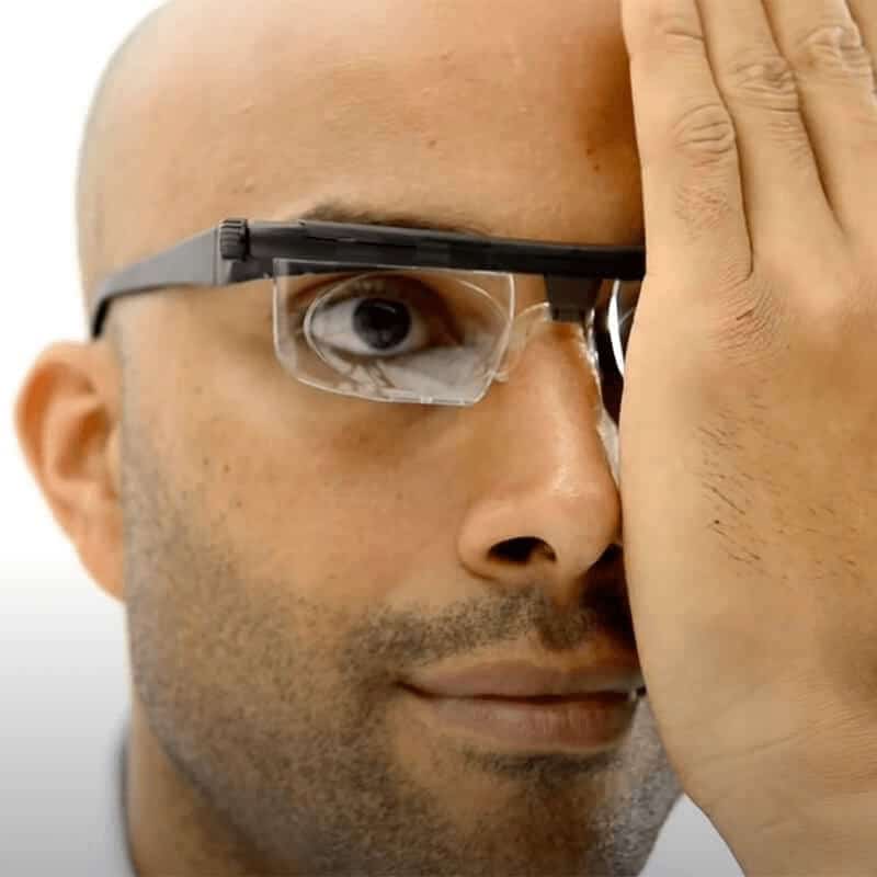 Régle toi-même la correction de chaque œil en quelques secondes. Une seule paire pour lire, conduire et regarder la télé.